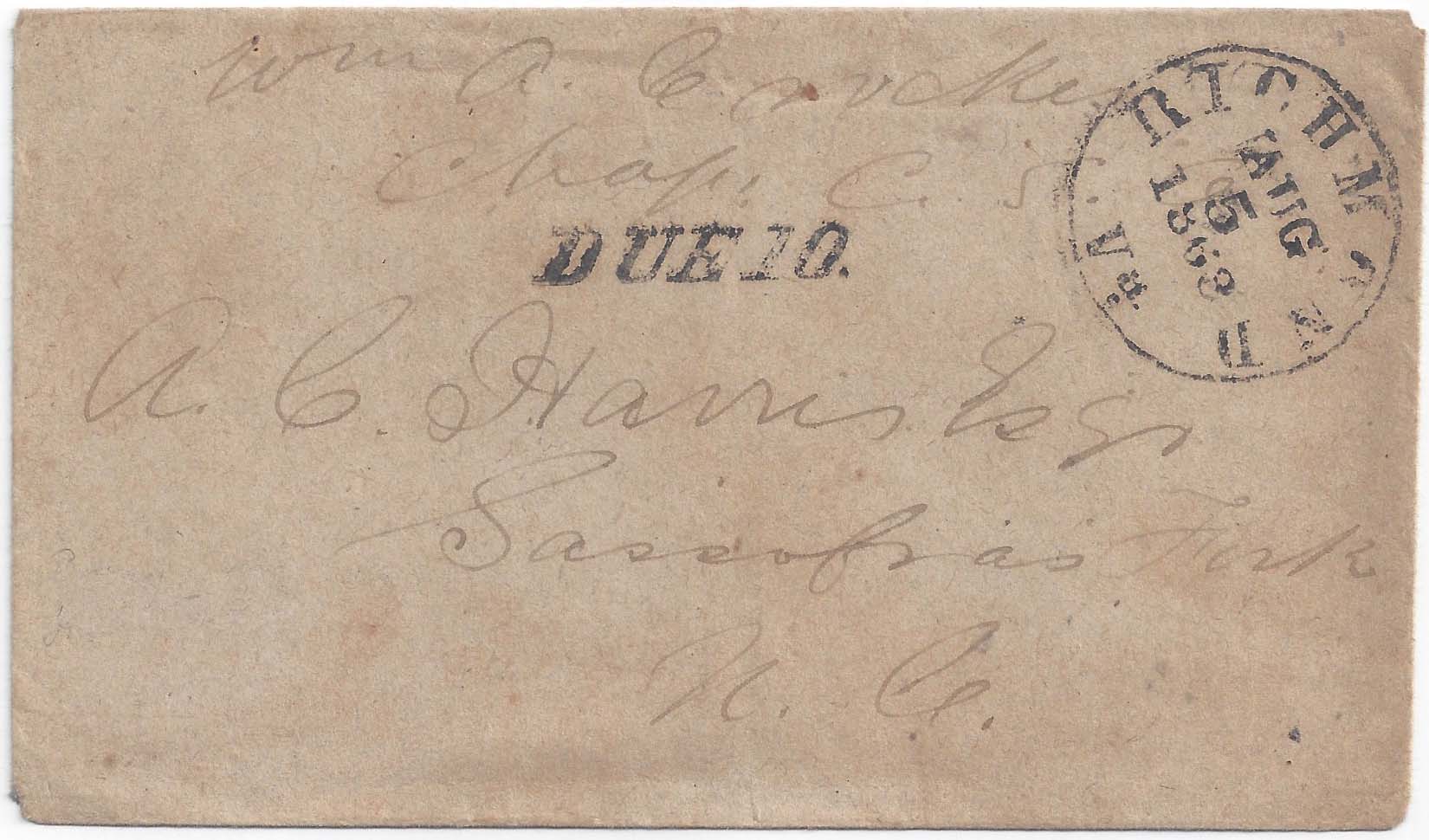 RICHMOND Va. AUG 5 1863 circular datestamp (Powell type 5f) with matching DUE 10 (type P) on cover to A.C. Harris Esq, Sassafras Fork, N.C. with mandated soldier’s endorsement from Wm. A. C….. (?) Chap(lain) C.S.A. Nice cover from unidentified Confederate chaplain. Ex Harry Muldrow. $100.