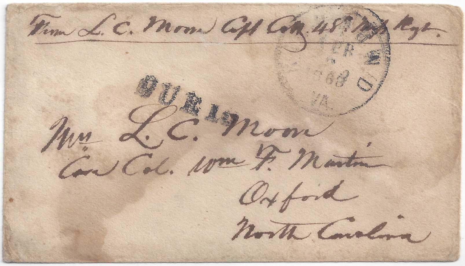 Capt. L.C. Moore: I initially had trouble finding information online about Moore, with AI insisting there was no such person. But the cover is unmistakably written as L.C. Moore 48th Mississippi, as primary a source as you can get. Click to see what I finally found on “Mississippians in the Confederate Army” :…at the opening of this campaign, the Brigade of Gen. Harris, consisted of about 1200 muskets. The regiments were, the 12th, Col. M.B. Harris; the 16th, Col. Sam’l. E. Baker, the 19th, Col. Thos. J. Hardin, and the 48th, Lt. Col. T.B. Manlove. (Col. Jayne being absent on leave)… Lt. Col. Manlove was wounded in the Wilderness, and the 48th was commanded successively by Capt. J.P. Rogers and Capt. L.C. Moore, until Col. J.M. Jayne, who was on leave of absence, returned, which was early in the campaign.