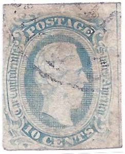 CSA 10, 10¢ blue frameline with frame at left and top, used with MOBILE ALA JUN 8 1863 double-circle datestamp, 3 light creases, SCV $2,750. $1,800. |