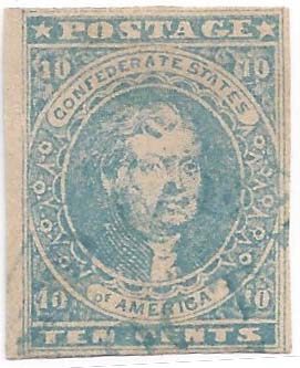 CSA 2-Ha, 10¢ dark blue Hoyer & Ludwig (Scott 2b) used with YORKTOWN Va. CDS, 2 shallow thins and lighest crease, JUMBO margins. $225. |
