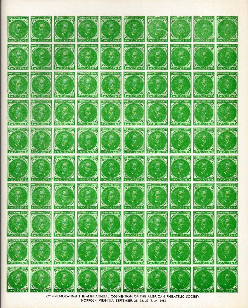 CSA Catalog #U-1b, the 1955 2¢ Altered Plate, Dietz 1955 sheets of 100 with inscription “Commemorating the 69th Annual Convention of the American Philatelic Society, Norfolk, Virginia, September 21, 22, 23 & 24, 1955.” Left edge does not fit on the scanner bed as is too large, but it is all there and sound. A sheet of 100 catalogs $50 in the CSA Catalog.