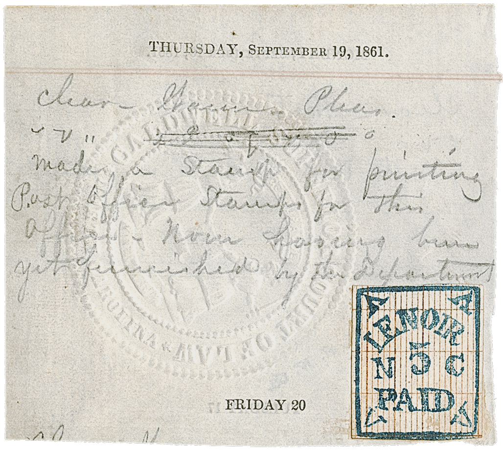 According to sworn testimony from James Harper and his son, the Lenoir provisional was impressed from a pear-wood device carved by Postmaster Harper's son and used on September 19, 1861. Crown records 16 covers used with 49X1. Ex Caspary, Muzzy, and Birkinbine. With 2009 Philatelic Foundation certificate. Scott value as an unused stamp without regard to the document and provenance is $7,250. This is a private treaty sale. Net price $14,000.