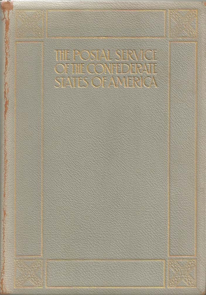 The Postal Service of the Confederate States of America by August Dietz 1929, 439 pages, DELUXE gray leather edition with gold lettering, laid paper, special end papers and special insert of impression from the original Archer & Daly steel plate (which alone sells for $150). The 1929 Dietz is still the standard work in Confederate philately almost a century after publication (not a catalog). Light rubbing on edges of spine and couple of spots, but generally great condition. Autographed by Dietz. Ex libris Thomas A. Cox. $400 + $9 shipping by media mail or $18 by priority mail. |
